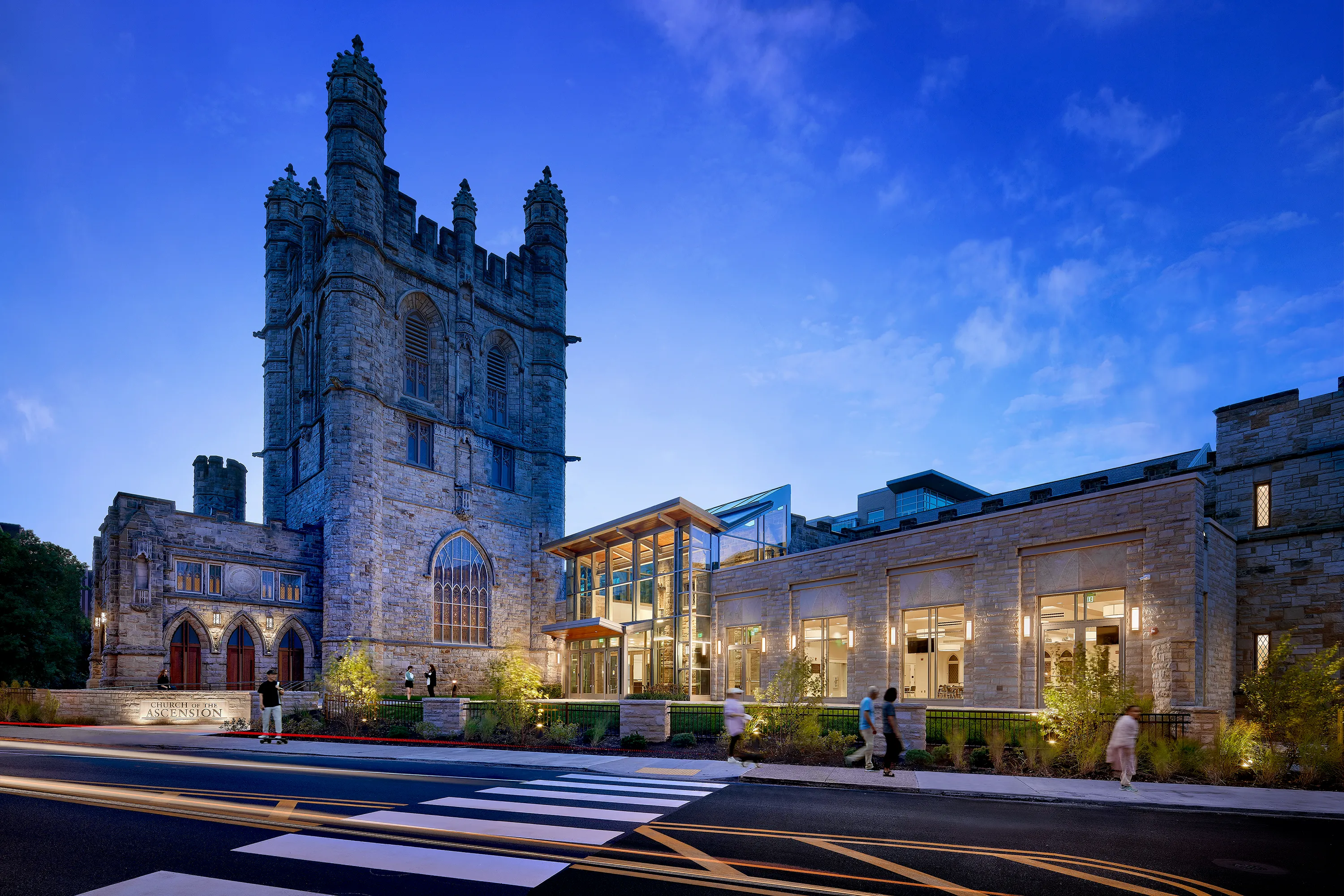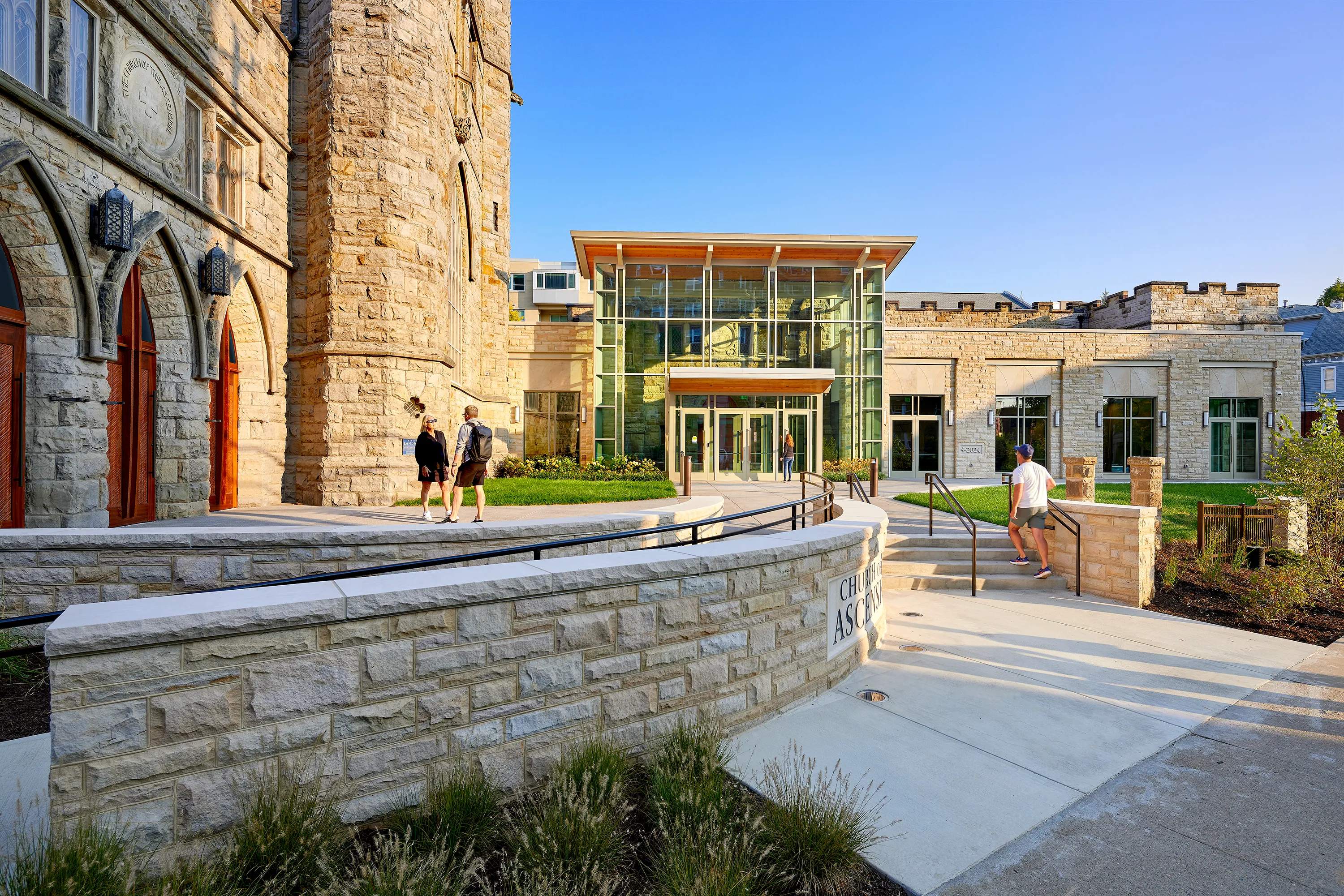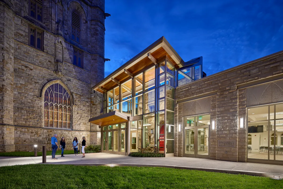 The new narthex replaced that with a two-story glass façade. Slim vertical mullions and broad glass panels that give the structure a sense of open weightlessness, visually dissolving the barrier between interior and exterior. An exposed wooden roof adds warmth and material contrast, making the addition feel crafted and inviting, rather than a purely modernist tack-on to a historic building.