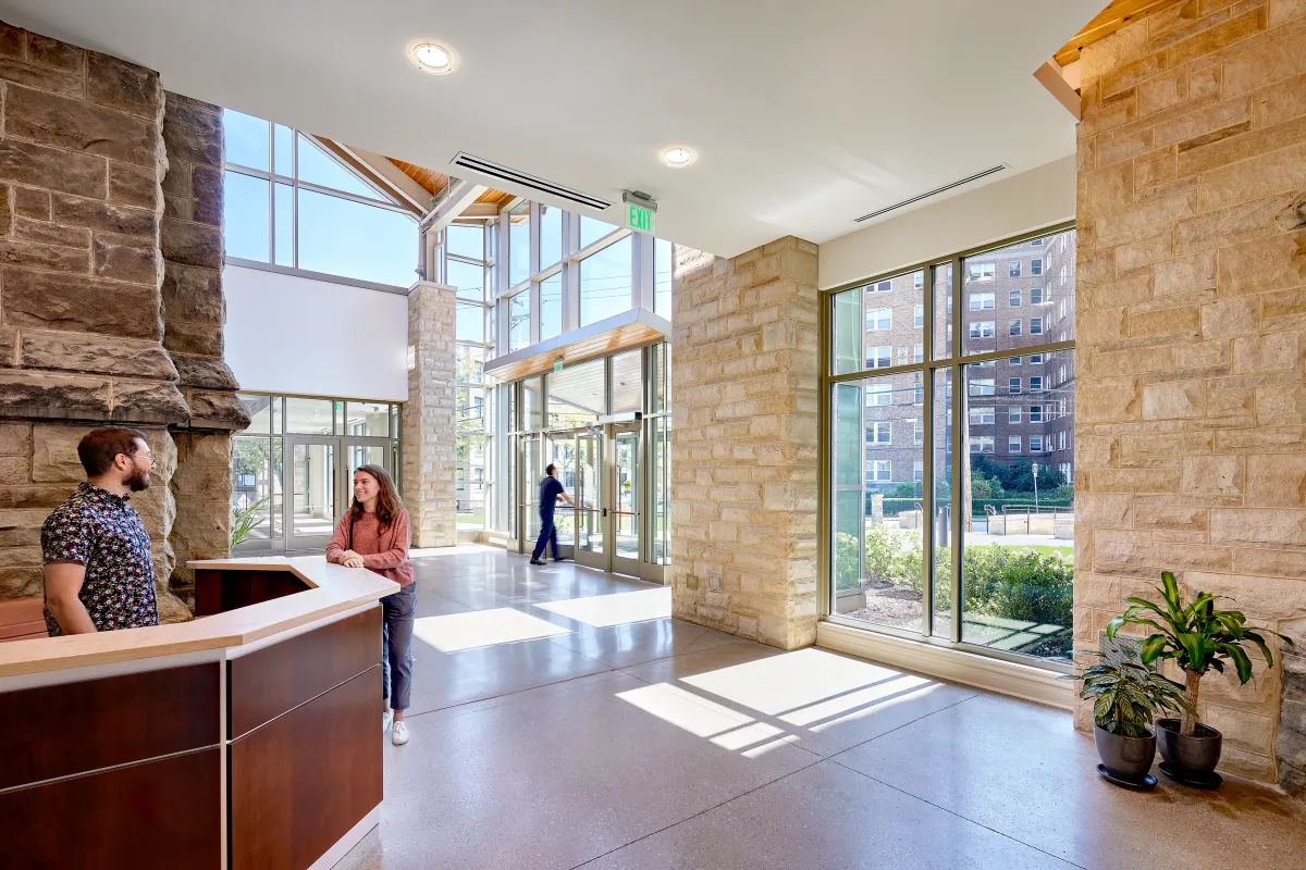 “We had regular design meetings with the owner as we develop the design, and we invited the construction manager so that they could hear the purpose behind the design decisions we're making. There are social goals that we're trying to elevate. We know there are different physical ways to manifest those social goals that have different economic impacts,” she says. “In early steering committee meetings, Scott and [Jendoco President] Michael Kuhn were at the committee meetings with us. As we were presenting design options, they were able to provide cost feedback and insights that would allow us to stay in line with the budget. We found that approach to be successful on several projects, especially those that are nonprofits with committees as the decision-making body. It allows us to seek out meaningful design solutions that balance the economic with the social and physical.”